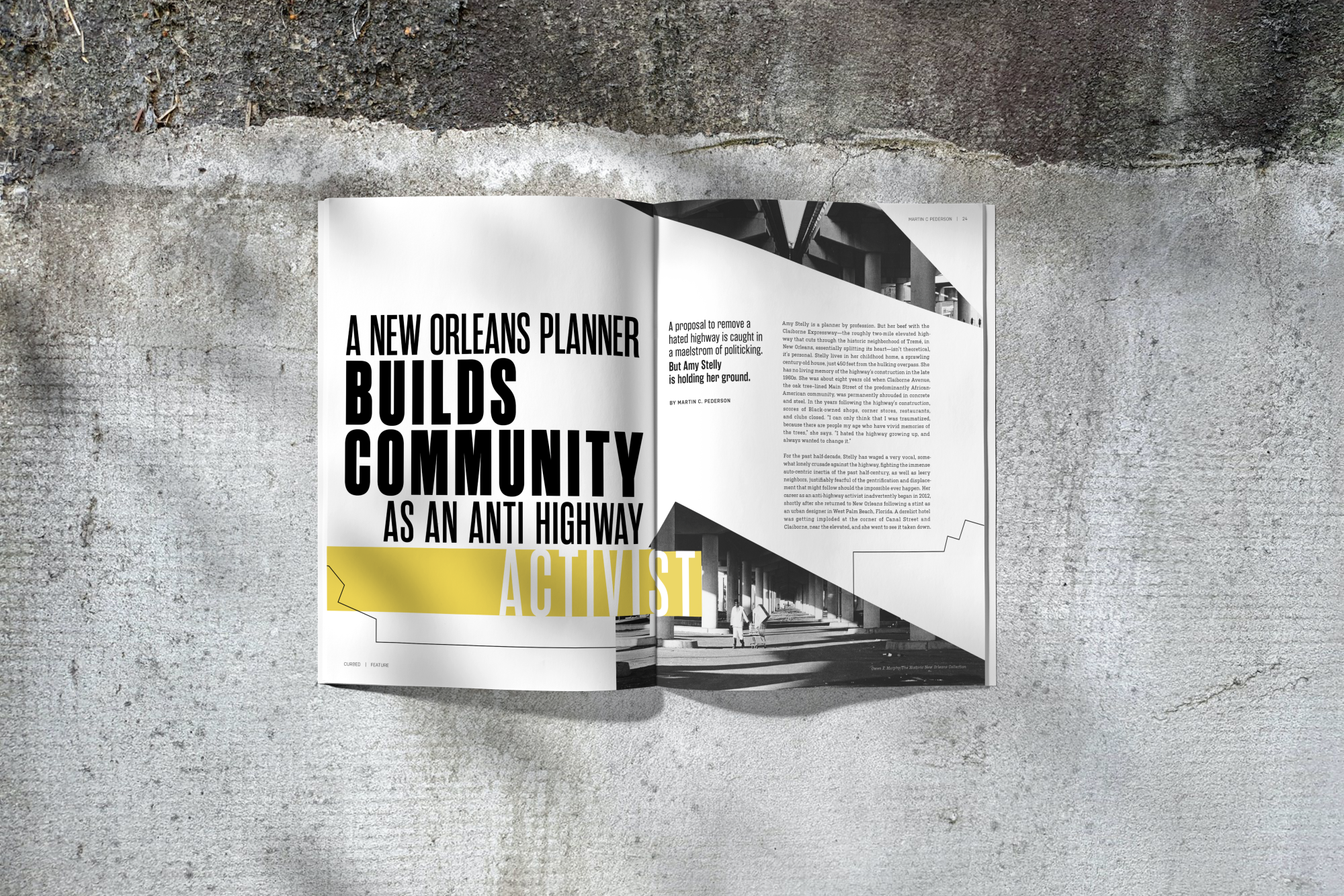 typography was meant to be stark and orderly, creating large blocks that traverse the pages. Titles and call-outs follow the style of the wordmark, and appear as cutouts from bands of color.